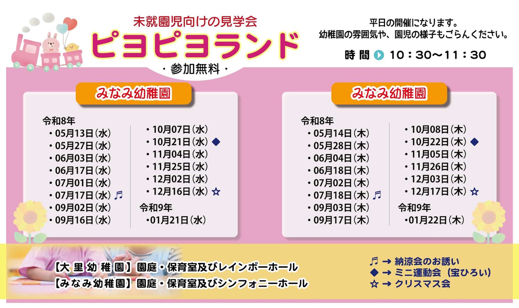 ●大里幼稚園 令和8年 ・ 05月13日(水) ・ 05月27日(水) ・ 06月03日(水) ・ 06月17日(水) ・ 07月01日(水) ・ 07月17日(水) ・ 09月02日(水) ・ 09月16日(水) ・ 10月07日(水) ・ 10月21日(水) ・ 11月04日(水) ・ 11月25日(水) ・ 12月02日(水) ・ 12月16日(水) 令和9年 ・ 01月20日(水) ●みなみ幼稚園 令和8年 ・ 05月14日(木) ・ 05月28日(木) ・ 06月04日(木) ・ 06月18日(木) ・ 07月02日(木) ・ 07月18日(木) ・ 09月03日(木) ・ 09月17日(木) ・ 10月08日(木) ・ 10月22日(木) ・ 11月05日(木) ・ 11月26日(木) ・ 12月03日(木) ・ 12月17日(木) 令和9年 ・01月22日(木) |